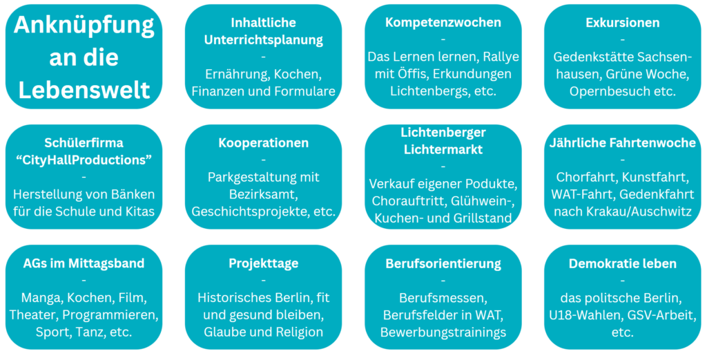 Über die Zusammenarbeit mit unseren Kooperationspartner hinaus berücksichtigen wir das Lebensumfeld der Schülerinnen und Schüler in der inhaltlichen Unterrichtsplanung (WAT => Kochen und Nähen | Biologie => Gesunde Ernährung und Babyprojekt | Ethik => interkulturelle Aspekte, interreligiöse Fragen, Gender-Thematik).